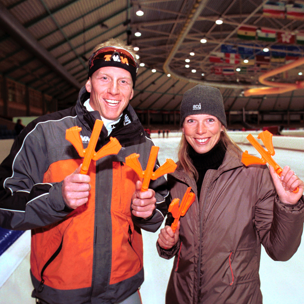 tot een rammelaar in de vorm van een klapschaats, waarmee de olympische schaatsers worden aangemoedigd.